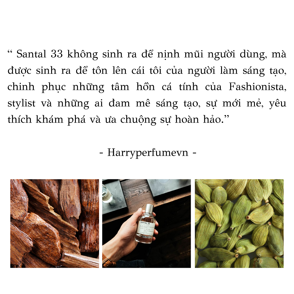 Với một rừng Gỗ Đàn Hương, Gỗ Tuyết Tùng và Bạch Đậu Khấu trong một chiếc lọ mang tên Santal 33 của nhà Le Labo sẽ dành cho người hiểu nó, như hiểu chính bản thân mình. Mình đặc biệt rất thích Santal 33, nhất là dùng vào mùa đông ở Đà Lạt, rất sang, rất ấm áp, rất gỗ và rất nghệ! – Harry.