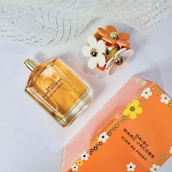 Marc Jacobs Daisy Ever So Fresh mang thiết kế cổ điển nhưng được nhấn nhá bằng màu sắc tươi sáng. Chai thủy tinh trong suốt để lộ chất lỏng vàng óng bên trong, tạo cảm giác ấm áp và rực rỡ. Nắp chai là các bông hoa cúc được phủ các tông màu cam, vàng và trắng, gợi lên sự trẻ trung, đầy sức sống và lôi cuốn ngay từ ánh nhìn đầu tiên.