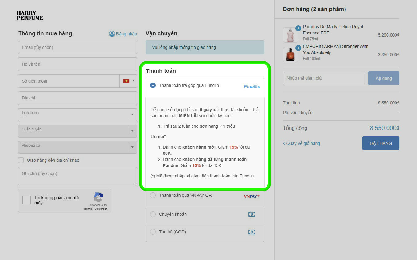 Đồng thơm lựa cho mình một chai nước hoa ưng ý, ấn vào phần "chốt chai này" hoặc "Tiến hành thanh toán" trong giỏ hàng để đến trang thanh toán. Tại trang thanh toán, đồng thơm điền đầy đủ nội dung tên, SDT, địa chỉ giao hàng, và chọn phương thức thanh toán qua Fundiin như hình: