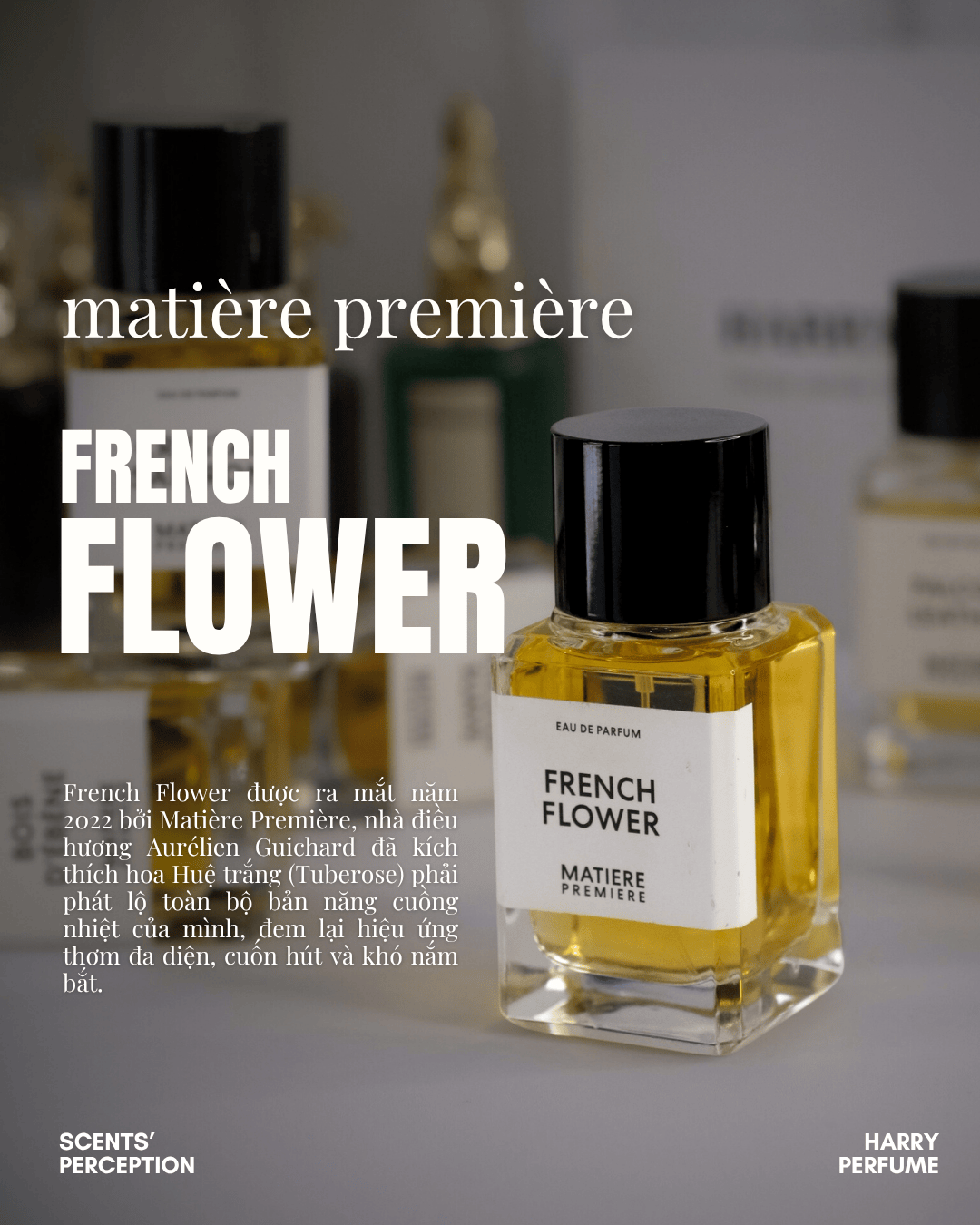 Trong thế giới thơm ngát của Matiere Premiere, French Flower hiện lên như một khúc tình ca lãng mạn, nơi hương thơm không chỉ thoảng qua khứu giác, mà khắc sâu trong ký ức như một mối tình đầu. Đêm Paris, ánh trăng bạc rơi trên vườn huệ trắng. Một người con gái khoác chiếc váy satin khẽ cúi đầu, và làn hương từ đó bừng nở. Huệ trắng tuyệt đối – tươi sáng, kiêu kỳ – như nhân vật nữ chính, rực rỡ mà mong manh, quyến rũ mà trong trẻo. Nhưng phía sau sự thánh thiện ấy, French Flower còn thì thầm những ẩn giấu: sự mơn man của cam bergamot căng mọng, sự ngọt dịu của pear accord, và chút nồng nàn thoáng ấm từ xạ hương.